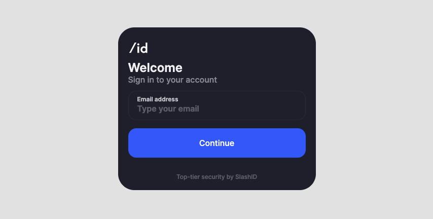 The Form comes with <ConfigurationProvider /> to easily customize some UI properties, such as theme and form factors. You can read more about SlashID Login Form customization here. You can choose from a variety of authentication factors, such as Passkeys (WebAuthn), SMS or SSO with third party providers like Google or Facebook. Let’s start with a basic onboarding form setup, choosing to only allow login with email via magic link.